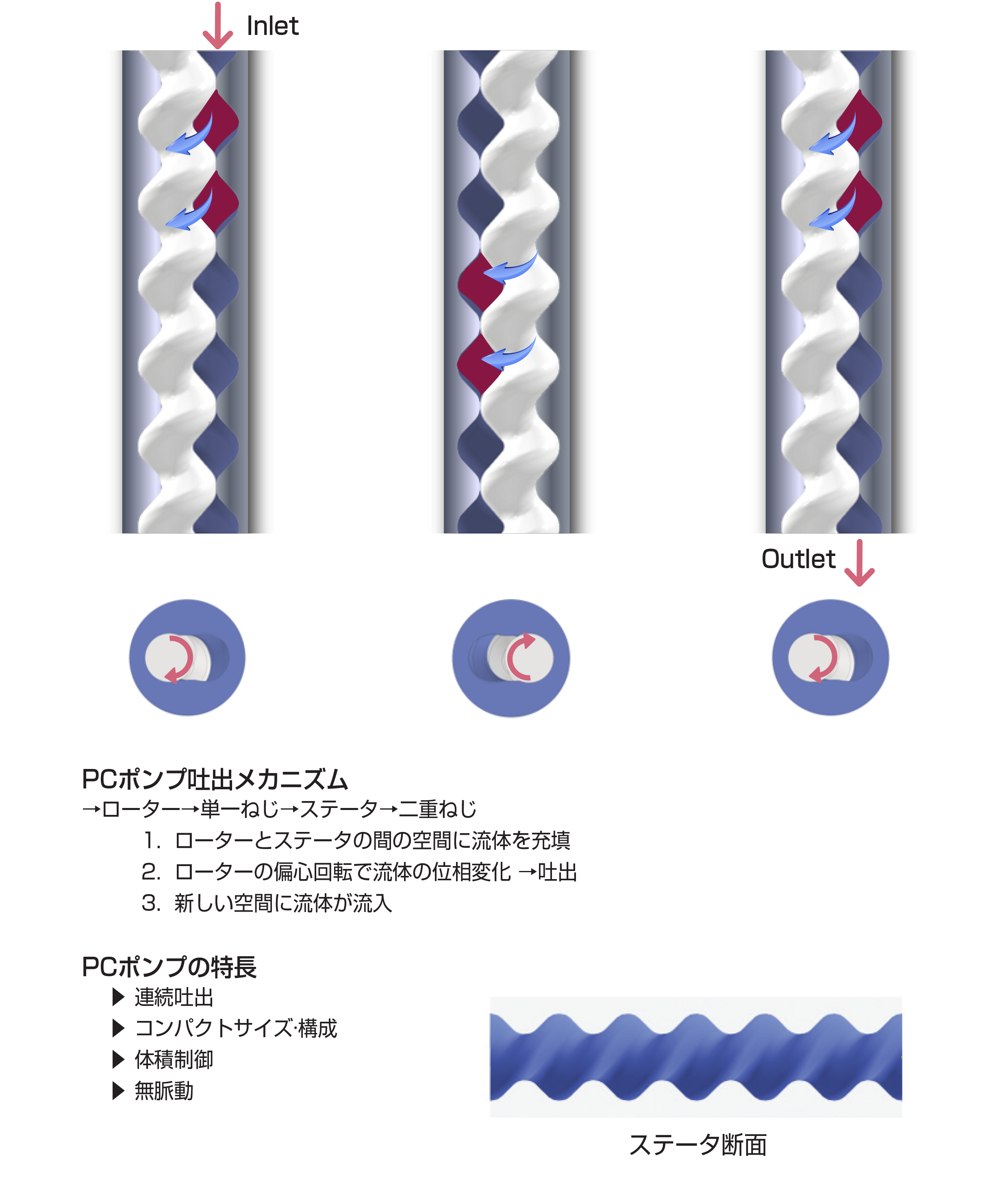 ローターが回転しながら、ローター&ステーター間の空いた空間(Cavity)の流体を連続的に次の空間に押し出す方式のポンプシステムで、ステーター内部のローターの回転で吐出と密閉が連続的に同時に行われ、モーター動作で吐出/密閉制御が可能です。モーターRPMで吐出流量を制御し、高粘度流体にも適用および浮遊物を含む流体にも適用が可能です。