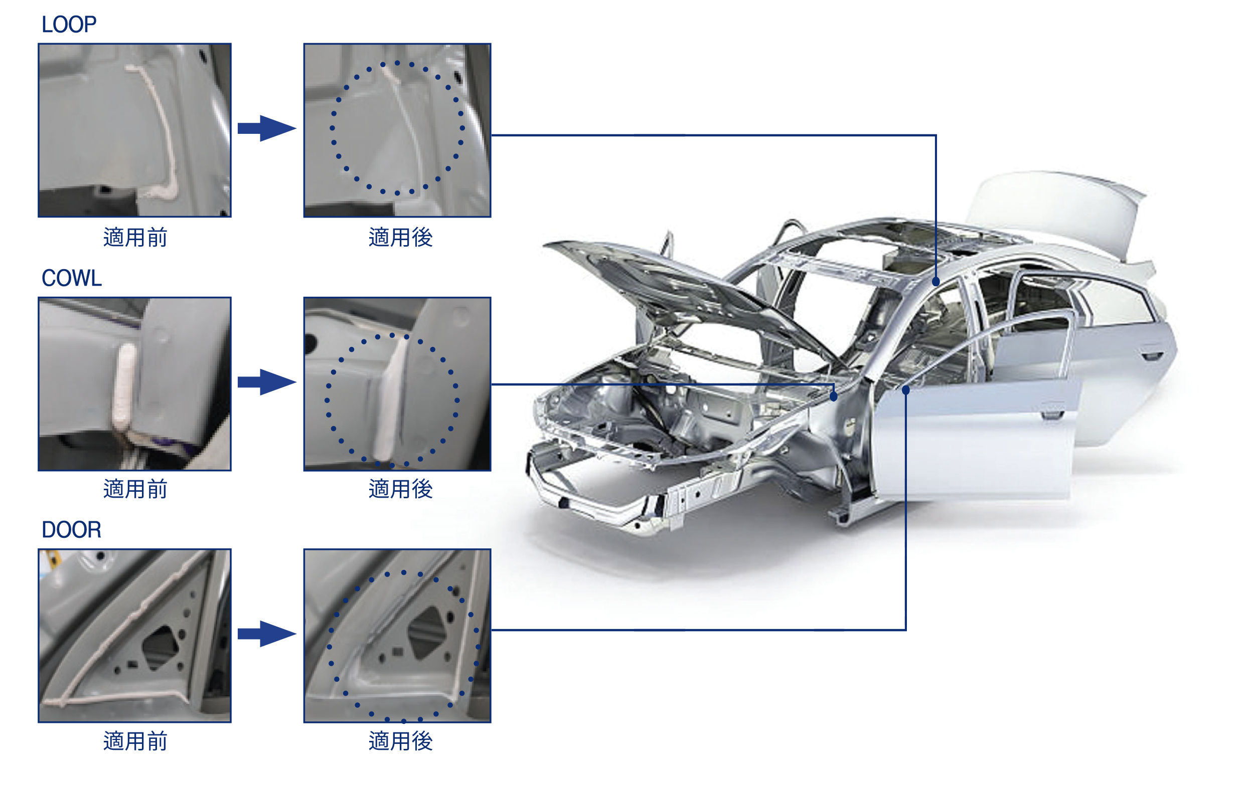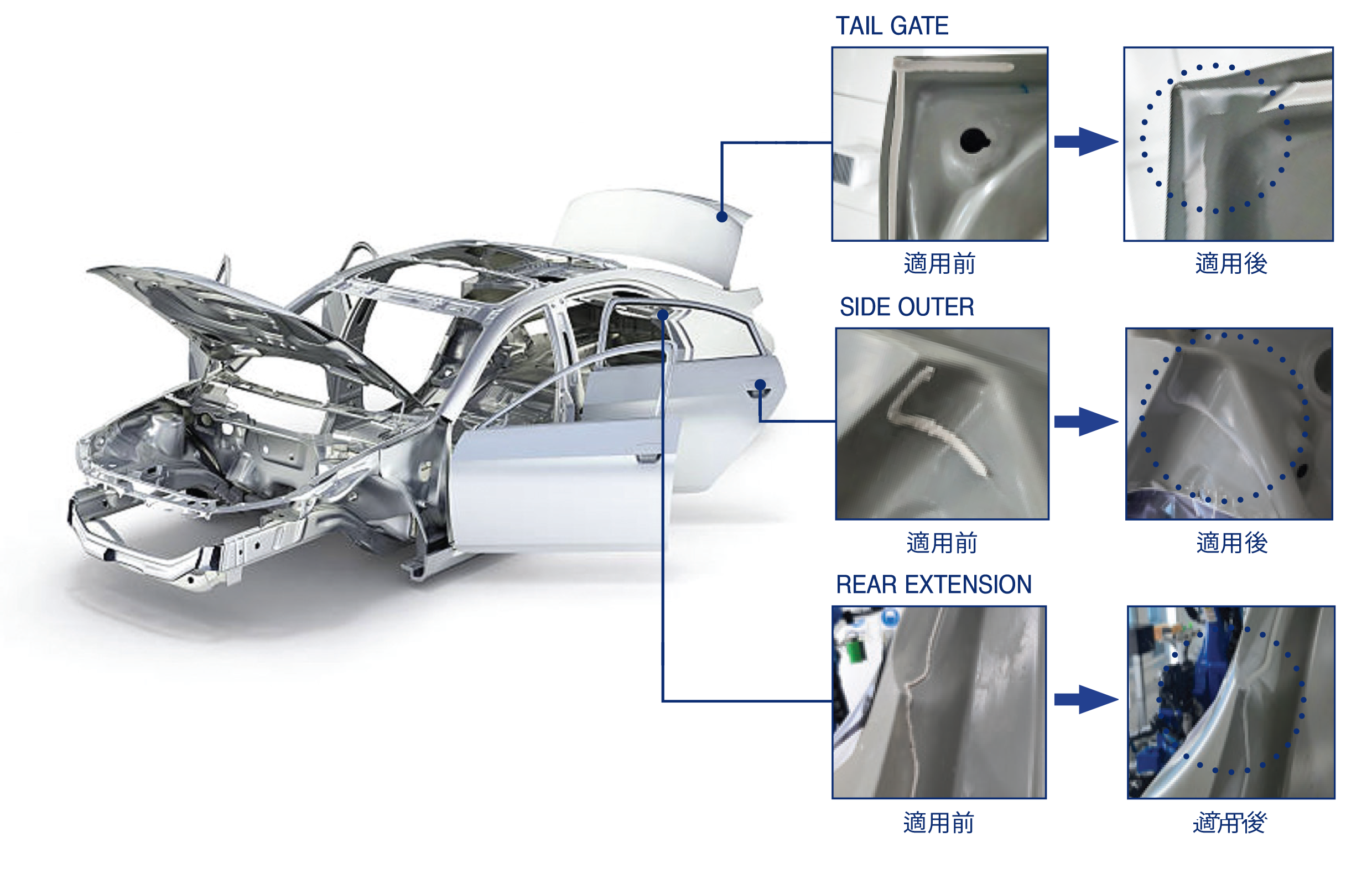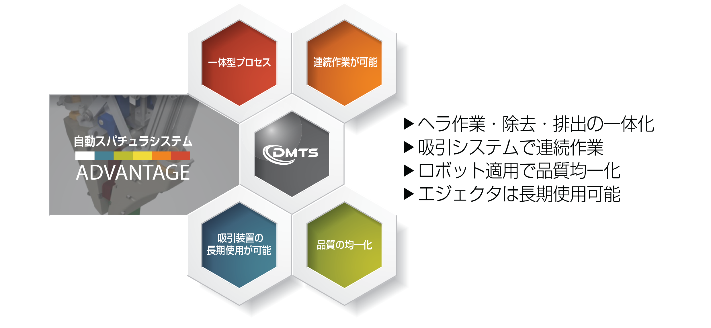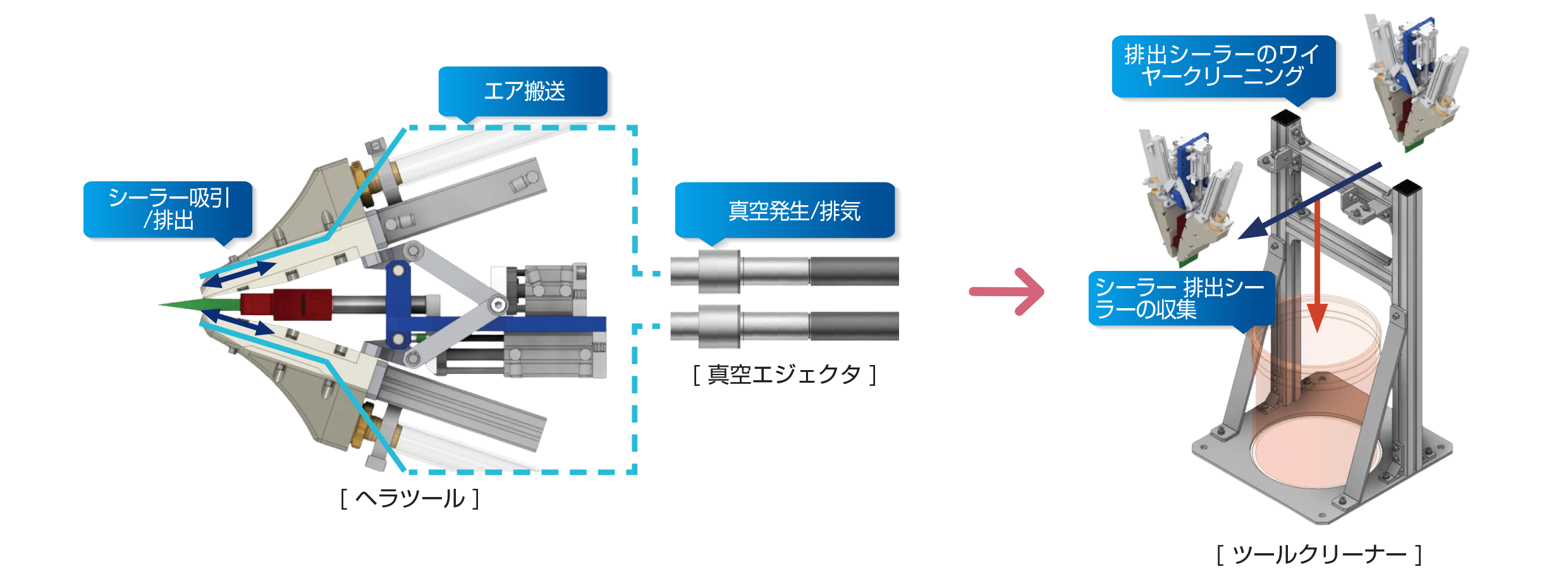 従来、シーラー干渉除去や外観品質向上のために行われてきたヘラ手作業を自動化したシステムです。 連続ヘラ作業・シーラー除去・排出が可能な一体型ヘラツールにより、生産性と品質の均一化を実現します.