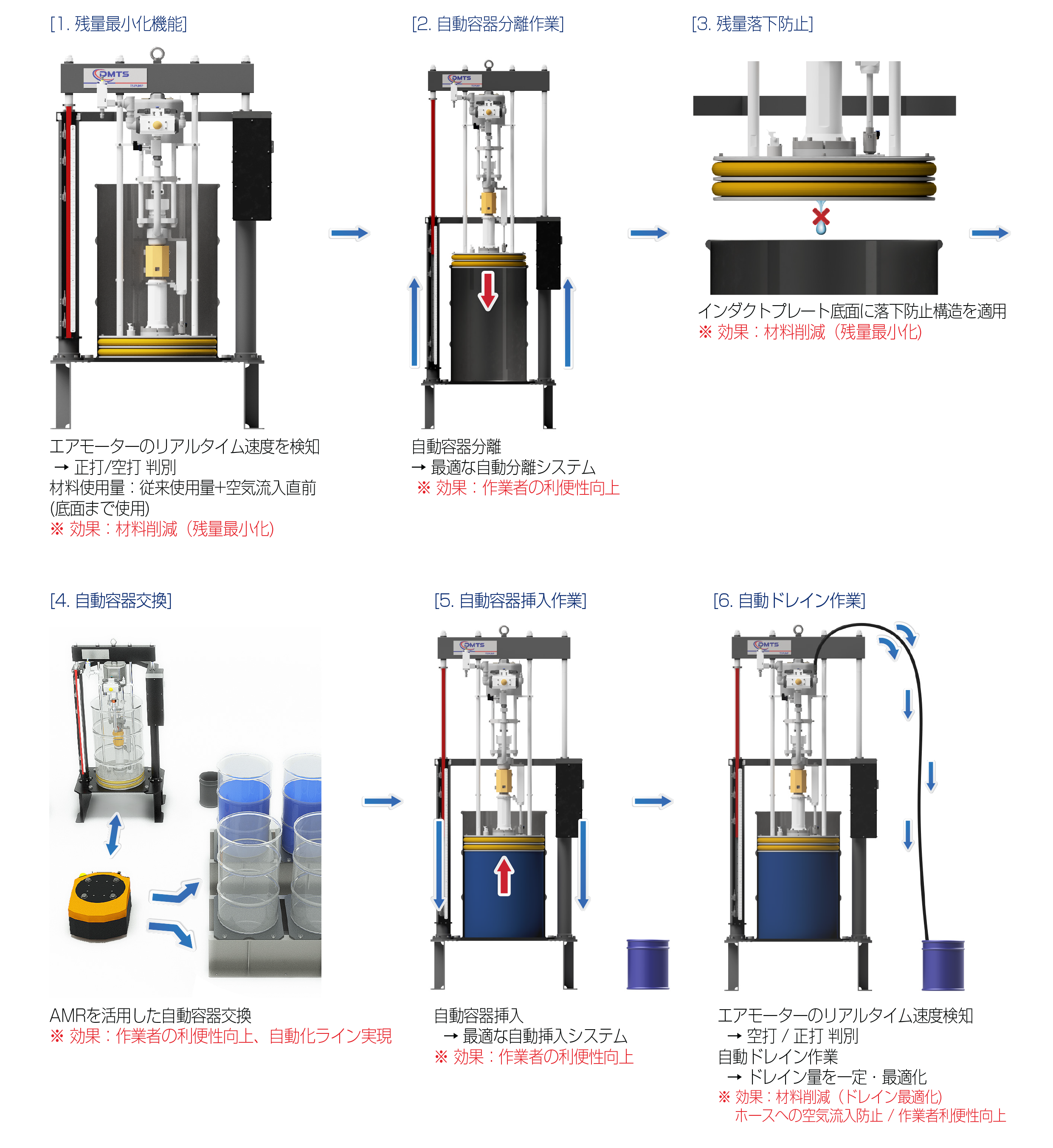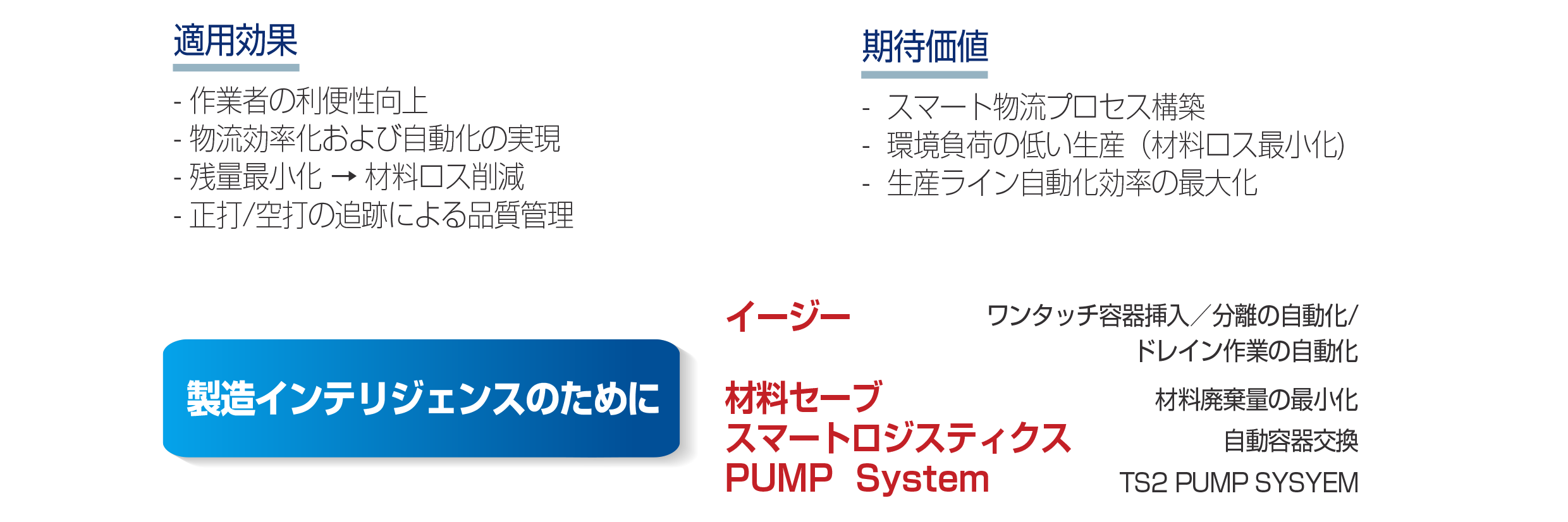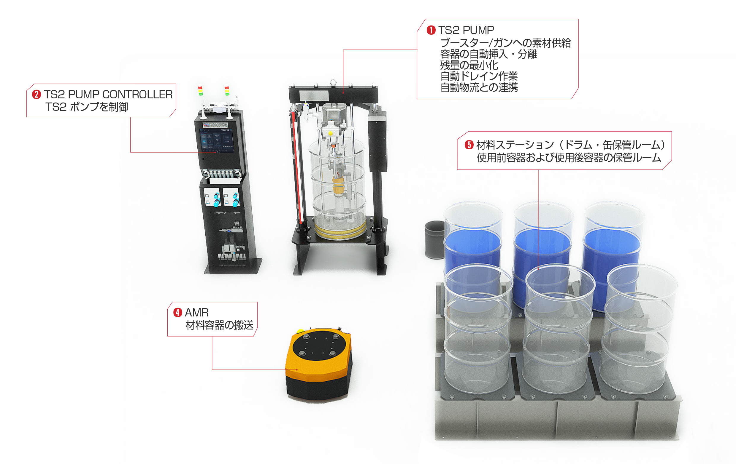 TS2 ポンプは、容器の挿入・分離およびドレイン作業を自動化したスマート物流ポンプシステムです。 ワンタッチによる自動挿入・自動分離、自動ドレイン、自動容器交換機能により作業効率を向上させ、残量最小化と落下防止構造により材料ロスを削減します。 さらに、正打/空打の追跡による品質管理が可能で、生産ラインの効率性と安定性を同時に実現します。