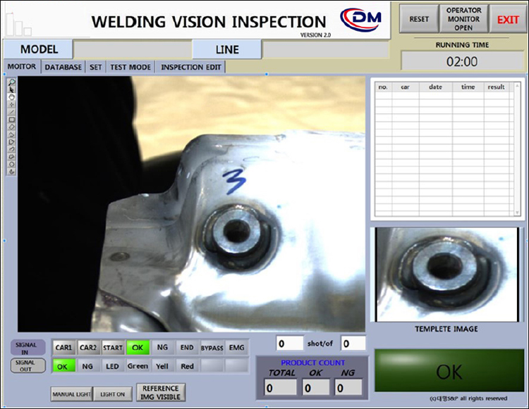 Co2 溶接 後 Camera, Illumination, PCを利用して 特定部位イメージ取得して 溶接脱漏 取得して溶接脱漏有無を判定する検査システムです。